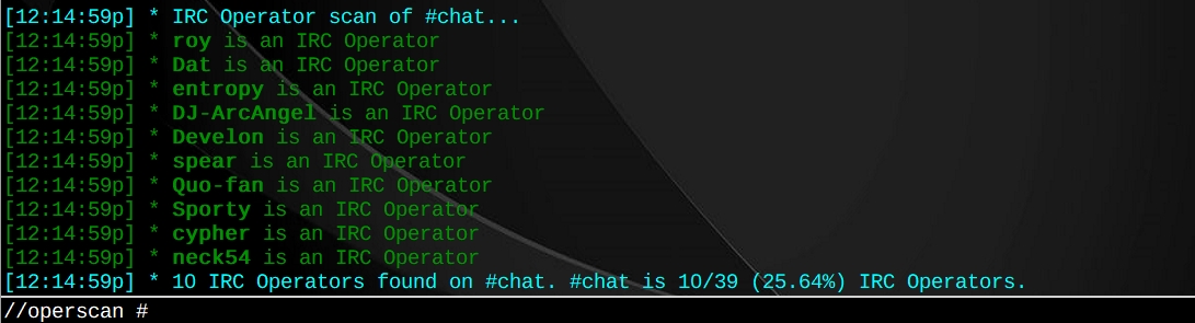 This snippet scans the channel supplieed for IRC Operators and returns a list.
