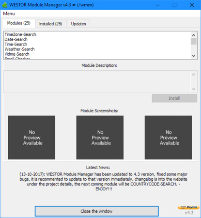 This manager is going to make your client or your Bot a bit more customable in order to install your own module easy just with ONE CLICK, the manager also gives you the ability to unistall an already installed module or also to re-install it, also the most powerfull think that this manager has is to checking for any available modules that are in the modules list if anyone of them want an update and place them into the list in order you can easy by pressing the Update button to update it into the latest version, it's one of the most important and one of the most wanted tools for your client, also it is multi-language supported as all of the modules that will be into the list and also you can add your own language or send to me your translated language to include it into the next release, also each of the modules that is into the list has an build-in settings window in order to setup or change any available setting that the module support it, if you have found any bug or you have a new feature or you want your own module to be included into this module manager just contact me at http://westor.ucoz.com/contact page.