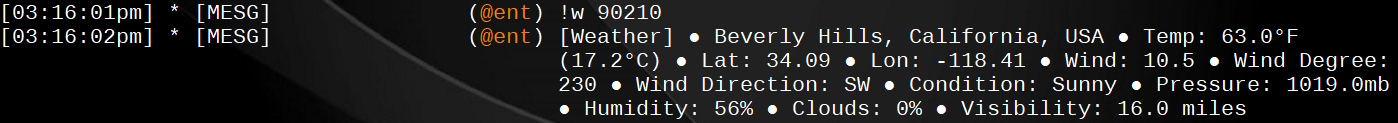 ; Weather v2.2 - by entropy 2023 ; Help: !weather <set> <location/zipcode> - If you specify <set>, set default location. Otherwise, displays the weather on location. ; Get your own API key: https://www.weatherapi.com/signup.aspx menu menubar,status,channel,query { - Weather v2.2 $chr(9) $replace($group(#weather).status,o,O) .Turn it $iif($group(#weather).status == on,Off,On) { $iif($group(#weather).status == on,.disable,.enable) #weather echo 3 -ag * Weather is now: $qt($replace($group(#weather).status,o,O)) } .- .Channel(s) $chr(9) $eval($+(%,weatherchans,.,$network),2) { var %net = $eval($+(%,weatherchans,.,$network),2) var %text = $input(Channels list (seperated by comma) or "#" for all?,5,Weather,%net) %text = $replace(%text,$chr(32),$chr(44)) var %a = 1, %b while ($gettok(%text,%a,44)) { %b = $v1 if ($left(%b,1) != $chr(35)) { %text = $reptok(%text,%b,$+($chr(35),%b),1,44) } inc %a } if (%text) { set $+(%,weatherchans,.,$network) $v1 | echo 3 -ag * Weather Channels are now: $qt($v1) } else { unset $+(%,weatherchans,.,$network) | echo 3 -ag * Weather Channels are now reset } } .$iif(!$istok($eval($+(%,weatherchans,.,$network),2),$chan,44) && $eval($+(%,weatherchans,.,$network),2) != $chr(35) && $menu == channel,Add Channel To list) { var %net = $eval($+(%,weatherchans,.,$network),2) var %net = $addtok(%net,$chan,44) set $+(%,weatherchans,.,$network) %net echo 3 -ag * Weather Channels are now: $qt($eval($+(%,weatherchans,.,$network),2)) } .$iif($istok($eval($+(%,weatherchans,.,$network),2),$chan,44) && $menu == channel,Delete Channel From list) { var %net = $eval($+(%,weatherchans,.,$network),2) var %net = $remtok(%net,$chan,1,44) set $+(%,weatherchans,.,$network) %net echo 3 -ag * Weather Channels are now $+ $iif(!%net,$chr(32) reset,: $qt(%net)) } .- .$iif($eval($+(%,weatherchans,.,$network),2),Delete all Channels) { unset $+(%,weatherchans,.,$network) echo 3 -ag * Weather Channels are now reset } .- .API Key $chr(9) $iif(%api_key,$v1,NA) { set %api_key $input(Weather API Key?,5) echo 3 -ag * Weather API is now: $qt(%api_key) } .- .Get an API key { run https://www.weatherapi.com/signup.aspx } - } #weather off on *:input:$($eval($+(%,weatherchans,.,$network),2)):{ if (/* !iswm $1 && $server) { loadit | doweather # $me $1- } } on *:text:*:$($eval($+(%,weatherchans,.,$network),2)):{ loadit | doweather # $nick $1- } #weather end ;================================================== on *:load:{ echo 3 -a * Weather is now loaded! | loadit } on *:unload:{ echo 3 -a * Weather is now unloaded! | unset %weatherchans.* %api_key | saveit | if ($hget(weather)) { hfree weather } } on *:exit:{ saveit } ;================================================== alias -l loadit { if (!$hget(weather)) { hmake weather 100 | if ($isfile($qt($mircdirweather.dat))) { hload weather $qt($mircdirweather.dat) } } } alias -l saveit { if ($hget(weather)) { hsave -o weather $qt($mircdirweather.dat) } } ;================================================== alias -l doweather { if (!$3) { return } elseif (!weather == $3 || !w == $3) { var %loc = $iif($4-,$v1,$hget(weather,$2)) weather # $2 %loc } } alias -l weather { if (!$2) { return } var %text = $3-, %target if ($findtok(%text,c,1,32)) { %text = $remtok(%text,c,1,32) } if ($findtok(%text,f,1,32)) { %text = $remtok(%text,f,1,32) } if ($gettok(%text,-1,44) == c) { %text = $remove(%text,$+($chr(44),c)) } if ($gettok(%text,-1,44) == f) { %text = $remove(%text,$+($chr(44),f)) } if ($right(%text,1) == $chr(44)) { %text = $mid(%text,1,-1) } if (!$3 && !$hget(weather,$2)) { msg $1 [Weather] $c No location specified! return } if ($gettok(%text,1,32) == set) { if ($gettok(%text,2-,32)) { hadd weather $2 $gettok(%text,2-,32) | %target = $gettok(%text,2-,32) } else { msg $1 [Weather] $c No location specified! | return } } if (!%target && $gettok(%text,1-,32)) { %target = $v1 } elseif (!%target) { %target = $hget(weather,$2) } set %_weatherchan $1 set %_weathernick $2 weatherAPI $+(https://api.weatherapi.com/v1/forecast.json?key=,%api_key,&q=,$urify(%target),&days=1&aqi=no&alerts=no) } ;================================================== alias -l weatherAPI { noop $urlget($1-,gbi,&Weather,processweatherAPI) } alias -l processweatherAPI { var %id = $1 , %BV = $urlget(%id).target, %code = $gettok($urlget(%id).reply,2,32) if (%code == 403) { msg %_weatherchan [Weather] $c Bad API Key! | unset %_weather* | return } elseif (%code != 200) { msg %_weatherchan [Weather] $c Error code: %code | unset %_weather* | return } var %total = [Weather] $c %total = %total $remove($bvsearch(%BV,"name":,$chr(44)).inbetween,") $+ , if ($remove($bvsearch(%BV,"region":,$chr(44)).inbetween,")) { %total = %total $v1 $+ , } var %country = $replace($remove($bvsearch(%BV,"country":,$chr(44)).inbetween,"),United States of America,USA) if ($numtok(%country,32) == 2 && $gettok(%country,1,32) == $gettok(%country,2,32)) { %country = $gettok(%country,1,32) } %total = %total %country %total = %total $c Temp: $bvsearch(%BV,"temp_f":,$chr(44)).inbetween $+ °F ( $+ $bvsearch(%BV,"temp_c":,$chr(44)).inbetween $+ °C) if ($bvsearch(%BV,"temp_f":,$chr(44)).inbetween != $bvsearch(%BV,"feelslike_f":,$chr(44)).inbetween) { %total = %total $c Feels like: $bvsearch(%BV,"feelslike_f":,$chr(44)).inbetween $+ °F ( $+ $bvsearch(%BV,"feelslike_c":,$chr(44)).inbetween $+ °C) } %total = %total $c Lat: $bvsearch(%BV,"lat":,$chr(44)).inbetween %total = %total $c Lon: $bvsearch(%BV,"lon":,$chr(44)).inbetween %total = %total $c Wind: $bvsearch(%BV,"wind_mph":,$chr(44)).inbetween %total = %total $c Wind Degree: $bvsearch(%BV,"wind_degree":,$chr(44)).inbetween %total = %total $c Wind Direction: $remove($bvsearch(%BV,"wind_dir":,$chr(44)).inbetween,") %total = %total $c Condition: $remove($bvsearch(%BV,"condition":,$chr(44)).inbetween,{"text":,") %total = %total $c Pressure: $bvsearch(%BV,"pressure_mb":,$chr(44)).inbetween $+ mb %total = %total $c Humidity: $bvsearch(%BV,"humidity":,$chr(44)).inbetween $+ % %total = %total $c Clouds: $bvsear