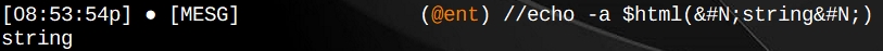 ; HTML Chars v1.0 - by entropy 2018 ; Replaces HTML characters based on &#N; ; Syntax: $html(&#N;string&#N;) alias html { var %a = 1, %b, %n, %c, %total = $1- while ($gettok(%total,%a,59)) { %b = $v1 %n = $+(&,$gettok(%b,-1,38)) if (&#* iswm %n) { %c = $remove(%n,$chr(59),$chr(38),$chr(35)) %total = $replace(%total,%n,$chr(%c)) } inc %a } return $remove(%total,;) }
