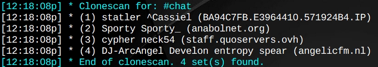 ; Small Clone Detector v1.3.4 - By entropy 2018 ; Place in remotes (alt+r) ; Usage: /clonescan <#channel> or /clonescan (when active window is a channel) ; Menu Definition: menu channel { - Clone Scan { clonescan # } - } ; Raws raw 352:*:{ halt } raw 315:*:{ clonescan $4 | halt } ; Aliases: alias clonescan { if (!$1 && $active !ischan) { return } if (!$1) { tokenize 32 $active } if ($chan($1).ial == $false) { echo $color(info) -ta * Updating IAL... | who $1 | return } if (!$hget(clones)) { hmake clones 100 } echo $color(info) -ta * Clonescan for: $1 var %z = 1, %b, %host, %nick, %found = 0 | while ($ialchan(*,$1,%z)) { %b = $v1 | %host = $mask($ialchan(*,$1,%z).host,3) | %nick = $ialchan(*,$1,%z).nick | hadd -m clones %host $hget(clones,%host) %nick | inc %z } var %zaa = 1, %b | while ($hget(clones,%zaa).item) { %b = $v1 | if ($numtok($hget(clones,%b),32) >= 2) { echo $color(own) -ta * ( $+ $calc(%found + 1) $+ ) $hget(clones,%b) ( $+ %b $+ ) | inc %found } | inc %zaa } echo $color(info) -ta * End of clonescan. %found set(s) found. | hfree clones }