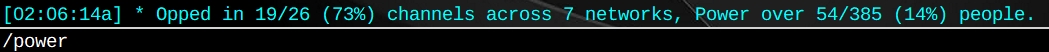 ; /Power v1.1 - by entropy 2017 alias power { if ($isid) { return } var %a = 1, %total = 0, %opped, %to, %nets, %ch while ($scon(%a)) { scid $v1 inc %ch $chan(0) %nets = %nets $network var %x = 1, %y while ($chan(%x)) { %y = $v1 inc %to $nick(%y,0) if ($me isop %y) { %opped = %opped %y | inc %total $nick(%y,0,rvh) } inc %x } inc %a } scid -r echo $color(info) -ta * Opped in $numtok(%opped,32) $+ / $+ %ch ( $+ $int($round($calc(($numtok(%opped,32) / %ch) * 100),2)) $+ % $+ ) channels across $numtok(%nets,32) networks, Power over %total $+ / $+ %to ( $+ $int($round($calc((%total / %to) * 100),2)) $+ % $+ ) people. }