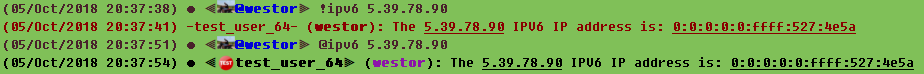 The description is a little misleading, saying "command that you enter", but really means a message someone ELSE types into #channel. For "!ipv6 5.39.78.90" this script sends the answer to THEM as a notice. For "@ipv6 5.39.78.90" output is instead sent as a /msg to the entire channel.