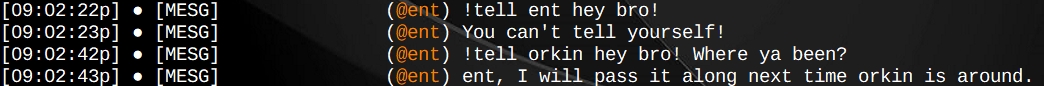 ; !tell v2.6 - by entropy 2023 on *:start:{ hmake tells 100 | if ($exists($qt($scriptdirtells.dat))) { hload tells $qt($scriptdirtells.dat) } | .timersaveall -o 0 300 saveallx } on *:exit:{ saveallx } on *:unload:{ .timersaveall off | if ($hget(tells)) { hfree tells } } alias -l saveallx { if ($hget(tells)) { hsave -o tells $qt($scriptdirtells.dat) } } alias -l unsafe return $!decode( $encode($1-,m) ,m) menu menubar,status,channel,query { - Tell v2.6 $chr(9) $+([,$replace($group(#tell).status,on,On,off,Off),]) { var %a = $group(#tell).status $iif(%a == off,.enable,.disable) #tell var %a = $group(#tell).status echo -tag $chr(9679) Tell v2.5 is now: $+($chr(2),$replace(%a,off,Off,on,On),$chr(2)) } - } #tell on on *:text:*:#:{ tellem $1- } on *:input:#:{ tellem $1- } alias -l tellem { if (?tell iswm $1 && $left($1,1) isin @!.) { if ($iif($event == text,$nick,$me) == $2) { .timertell -o 1 1 msg $unsafe( # ) You can't tell yourself! } elseif ($2) { if (!$3) { msg # No text specified to send! | return } var %2 = $remove($2,$chr(44),$chr(46),:) hadd -m tells $+($iif($event == text,$nick,$me),.,%2,.,$ctime,.,$network) $strip($3-) .timertell -o 1 1 msg $unsafe( # ) $iif($event == text,$nick,$me) $+ $chr(44) I will pass it along next time %2 is around. } else { msg # No such user specified! } } else { $+(.timerjoin,#,$network) -o 1 2 dojoin $iif($event == text,$nick,$me) $network $unsafe( # ) } } on *:action:*:#:{ $+(.timerjoin,#,$network) -o 1 2 dojoin $nick $network $unsafe( # ) } alias -l dojoin { var %a = 1, %b, %t = 0 while ($hfind(tells,$+(*.,$1,.*.,$2),1,w).item) { %b = $v1 inc %t 2 var -n %g = $hget(tells,%b) .timer -o 1 %t .notice $1 $gettok(%b,1,46) said: " $+ %g $+ " $asctime($gettok(%b,3,46)) $+($chr(40),$remove($replace($duration($calc($ctime - $gettok(%b,3,46))),wks,w,wk,w,days,d,day,d,hrs,h,hr,h,mins,m,min,m,secs,s,sec,s),$chr(32)) ago,$chr(41)) hdel tells %b } } #tell end
