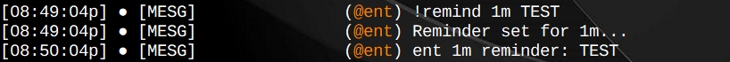 ; Reminder v1.3 - by entropy 2018 ; syntax: !remind 1h23m <text> #reminder on alias -l safe return $!decode( $encode($1-, m) ,m) alias -l gettime { var %a = 1, %b, %c = $replace($1,h,$+(h,$chr(1)),m,$+(m,$chr(1)),s,$+(s,$chr(1))), %secs = 0 while ($gettok(%c,%a,1)) { %b = $v1 if (h isin %b) { inc %secs $calc($remove(%b,h) * 60 * 60) } if (m isin %b) { inc %secs $calc($remove(%b,m) * 60) } if (s isin %b) { inc %secs $remove(%b,s) } inc %a } return %secs } on *:input:#:{ remind $1- } on *:text:*:#:{ remind $1- } alias -l remind { if (?remind iswm $1 && $left($1,1) isin @!.) { if ($2) { if (secs isin $2 || sec isin $2 || mins isin $2 || min isin $2 || hrs isin $2 || hours isin $2 || hour isin $2 || hr isin $2) { msg # Invalid time! Syntax: !remind $+($chr(2),1h23m10s,$chr(2)) <text> } elseif (w isin $2 || weeks isin $2 || d isin $2 || days isin $2 || y isin $2 || year isin $2 || years isin $2) { msg # You can only remind hours, mins and secs! } elseif ($2 isnum || $2 !isalnum) { msg # Invalid time! Syntax: !remind $+($chr(2),1h23m10s,$chr(2)) <text> } elseif ($gettime($2) < 60 || $gettime($2) > 86400) { msg # Invalid time! It must be between 1m and 24h! } elseif ($3) { msg # Reminder set for $2 $+ ... .timer -o 1 $gettime($2) msg # $nick $2 reminder: $safe($3-) } else { msg # No text specified! } } else { msg # No duration specified! } } } #reminder end