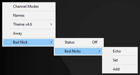 ; Bad Nick v2.3 - by entropy 2018 menu menubar,status,channel,query { - Bad Nick .Status $chr(9) $iif($group(#felix).status == on,On,Off) { $iif($group(#felix).status == on,.disable,.enable) #felix echo $color(info) -tag $chr(9679) Bad Nicks Status is now: $+($chr(2),$replace($group(#felix).status,on,On,off,Off),$chr(2)) } .- .Bad Nicks ..Echo { echo $color(info) -tag $chr(9679) Bad Nicks are: $+($chr(2),%badnicks,$chr(2)) } ..- ..Set { var %a = $input(Bad Nicks? (sep. by space),5) %badnicks = %a } ..- ..Add { var %a = $input(Bad Nick to add?,5) if (%a) { %badnicks = %badnicks %a } } - } #felix off on @*:join:#:{ if ($wildcard($nick)) { .msg $nick You have a bad nickname! You have 2 minutes to change nicks or i will ban you. $+(.timer,$nick) -o 1 120 doit $nick } } on !*:nick:{ if ($wildcard($newnick)) { .msg $newnick You have a bad nickname! You have 2 minutes to change nicks or i will ban you. $+(.timer,$newnick) -o 1 120 doit $newnick } elseif ($timer($nick)) { $+(.timer,$nick) off } } alias -l doit { var %a = 1, %b while ($comchan($1,%a)) { %b = $v1 if ($1 ison %b && $me isop %b) { mode %b +b $+($1,!*@*) kick %b $1 Bad Nick } inc %a } } alias -l wildcard { var %a = 1, %b while ($gettok(%badnicks,%a,32)) { %b = $v1 if (%b iswm $1 || %b == $1) { return $true } inc %a } } #felix end