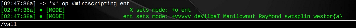 ; Voice/Devoice All v1.0.5 - by entropy 2018 ; Syntax: /vall and /dvall alias vall { if ($me isop #) { var %a = 1, %b, %re | while ($nick(#,%a,r)) { %re = %re $v1 | inc %a } | pushmodex # $+(+,$str(v,$numtok(%re,32))) %re } } alias dvall { if ($me isop #) { var %a = 1, %b, %re | while ($nick(#,%a,v)) { %re = %re $v1 | inc %a } | pushmodex # $+(-,$str(v,$numtok(%re,32))) %re } } alias -l pushmodex { if (-t* iswm $1) { var %time = $mid($1,3) , %count = 0 | tokenize 32 $2- } else { var %time = 0 , %count = 0 } var %modespl = $modespl , %chan = $1 , %modes = $2 , %parms = $3- , %x = 1 , %y = $len(%modes) , %lwhich = + , %which = + , %a , %b tokenize 44 $chanmodes var %t1 = $1 , %t2 = $nickmode $+ $2 , %t3 = $3 , %t4 = $4 tokenize 32 %parms while (%x <= %y) { var %t = $mid(%modes,%x,1) if (%t isin +-) { var %lwhich = %which , %which = %t } else { if (%t isincs $gettok(%t1 %t2 %t3, 1- $pos(.-+, %which),32)) { var %b = %b $1 tokenize 32 $2- } var %a = $+(%a,$iif(!%a || %lwhich != %which,%which),%t) , %lwhich = %which if ($len($remove(%a,+,-)) = %modespl) { if (!%time) { mode %chan %a %b } else { .timer -m 1 $calc(%time * %count) mode %chan %a %b } var %a = "" , %b = "", %count = %count + 1 } } inc %x } if (%a) { if (!%time) { mode %chan %a %b } else { .timer -m 1 $calc(%time * %count) mode %chan %a %b } } }