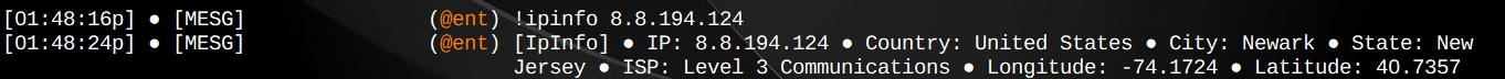 ; IP Info v1.5 - by entropy 2019 ; Grabs JSON from: http://ipinfo.io/{$ip}/geo ; Syntax: !ipinfo <IP> #ipx on on *:text:*:#:{ if (?ipinfo iswm $1 && $2 && $left($1,1) isin .@!) { getip $2 # } } on *:input:#:{ if (?ipinfo iswm $1 && $server && /* !iswm $1 && $2 && $left($1,1) isin .@!) { getip $2 # } } #ipx end alias -l getip { sockclose xip sockopen -46 xip ipinfo.io 80 sockmark xip $1 %xchan = $2 %xline = "" } on *:sockopen:xip:{ if ($sockerr) { msg %xchan [IPinfo] $c Open Error! | unset %xchan %xline | return } sockwrite -n $sockname GET $+(http://ipinfo.io/,$sock($sockname).mark,/geo) HTTP/1.1 sockwrite -n $sockname Host: ipinfo.io sockwrite -n $sockname User-Agent: Mozilla/5.0 (Windows NT 10.0; Win64; x64; rv:62.0) Gecko/20100101 Firefox/62.0 sockwrite -n $sockname Accept-Language: en-US sockwrite -n $sockname Content-Type: application/json; charset=utf-8 sockwrite -n $sockname $str($crlf,2) } on *:sockread:xip:{ if ($sockerr) { msg %xchan [IPinfo] $c Read Error! | unset %xchan %xline | return } var %x, %2 sockread -f %x tokenize 32 %x if ("*": * iswm $1-) { var %2 = $remove($2-,",$chr(44)) if ($1 == "ip":) { %xline = [IPinfo] $c IP: %2 } if ($1 == "city":) { %xline = %xline $c City: %2 } if ($1 == "region":) { %xline = %xline $c Region: %2 } if ($1 == "country":) { %xline = %xline $c Country: %2 } if ($1 == "loc":) { %xline = %xline $c Location: $replace(%2,-,$+($chr(44),-)) } if ($1 == "timezone":) { %xline = %xline $c Timezone: %2 | endxit | sockclose $sockname } } if ($chr(125) isin $1) { endxit | sockclose $sockname } } alias -l endxit { if (%xline) { msg %xchan %xline } else { msg %xchan [IPinfo] $c Nothing found! } unset %xline %xchan } alias -l c { return $chr(9679) }
