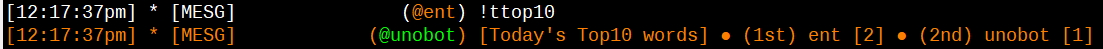 ; Basic Stats v1.4 - by entropy 2020 ; Syntax: !cstats (total stats) ; Syntax: !tstats (today's stats) ; Syntax: !top10 <stat> ; Syntax: !ttop10 <stat> (today's stats) ; %nostats nicks to not use stats here menu channel,status,menubar,query { - Stats Channels v1.4 .Turn $iif($group(#stats).status == on,Off,On) { $iif($group(#stats).status == on,.disable,.enable) #stats echo -tag $chr(9679) [Stats] is now: $replace($group(#stats).status,o,O) } .- .Set Channels { var %a = $input(Stats Channels? (sep. by comma),5,Stats Channels:,%stats_chans) | if (%a) { %stats_chans = %a | echo -tag $chr(9679) [Stats] Channels now: %a } } - } on *:unload:{ echo -tag $chr(9679) [Stats] unloaded! | unset %stats_chans } on *:load:{ echo -tag $chr(9679) [Stats] v1.4 loaded - by entropy 2020 } #stats on on *:start:{ clearoldstats .timerupdatestats -o 0 86400 clearoldstats } alias -l getstats { ;$getstats(<file>,<nick>) if ($read($1,wn,* $2)) { return $gettok($v1,1,32) } else { return 0 } } alias -l getstat { return $iif($read($1,w,* $2),$+($chr(40),$ord($readn),$chr(41))) } alias -l getfile { var %a = $remove($mklogfn(#),.log,$+(.,$network),#) | if (!%a) { %a = # } | return $qt($+($scriptdir,Stats\,$network,.,%a,.,$1,.txt)) } alias -l getfile2 { var %a = $remove($mklogfn($1),.log,$+(.,$network),$1) | if (!%a) { %a = $1 } | return $qt($+($scriptdir,Stats\,$network,.,%a,.,$2,.txt)) } alias -l getfile3 { var %a = $remove($mklogfn(#),.log,$+(.,$network),#) | var %r = $replace($adate,/,-) | if (!%a) { %a = # } | return $qt($+($scriptdir,Today\,$network,.,%r,.,%a,.,$1,.txt)) } alias -l getfile4 { var %a = $remove($mklogfn($1),.log,$+(.,$network),$1) | var %r = $replace($adate,/,-) | if (!%a) { %a = $1 } | return $qt($+($scriptdir,Today\,$network,.,%r,.,%a,.,$2,.txt)) } alias delstats { ;/delstats <nick> if (!$1) { return } var %a = 1, %b, %s = words chars lines colors modes joins parts quits nicks actions kicks kicked topics smiles swears while ($chan(%a)) { %b = $v1 var %x = 1, %y while ($gettok(%s,%x,32)) { %y = $v1 if ($read($getfile2(%b,%y),w,* $1)) { write -dl $+ $readn $getfile2(%b,%y) } if ($read($getfile4(%b,%y),w,* $1)) { write -dl $+ $readn $getfile4(%b,%y) } inc %x } inc %a } } alias clearoldstats { var %a = 1, %b, %c, %total = 0 while ($findfile($qt($scriptdirToday),*.txt, %a)) { %c = $v1 %b = $gettok(%c,2,46) if ($replace($adate,/,-) != %b) { inc %total | .remove $qt(%c) } inc %a } ;echo -tag Done. %total file(s) deleted! } alias -l dostats { ;/dostats <file> <N> <nick> if ($istok(%nostats,$3,32)) { return } if (!$isdir($qt($scriptdirStats))) { mkdir $qt($scriptdirStats) } if (!$isdir($qt($scriptdirToday))) { mkdir $qt($scriptdirToday) } if ($read($1,wnt,* $3)) { write -dl $+ $readn $1 } var %a = 1, %b, %added = no while ($read($1,nt,%a)) { %b = $v1 if ($2 >= $gettok(%b,1,32)) { write -il $+ %a $1- | %added = yes | break } inc %a } if (%added == no) { write $1- } } on *:input:%stats_chans:{ if (/* !iswm $1 && $server) { morestats $me $1- } } on *:text:*:%stats_chans:{ morestats $nick $1- } alias -l morestats { tokenize 32 $1 $strip($2-) var %a = $getfile(words) | dostats %a $calc($getstats(%a,$1) + $numtok($2-,32)) $1 var %a = $getfile(chars) | dostats %a $calc($getstats(%a,$1) + $len($remove($2-,$chr(32)))) $1 var %a = $getfile(lines) | dostats %a $calc($getstats(%a,$1) + 1) $1 var %a = $getfile3(words) | dostats %a $calc($getstats(%a,$1) + $numtok($2-,32)) $1 var %a = $getfile3(chars) | dostats %a $calc($getstats(%a,$1) + $len($remove($2-,$chr(32)))) $1 var %a = $getfile3(lines) | dostats %a $calc($getstats(%a,$1) + 1) $1 ; Smilies var %b = 1, %c = :S :X :D :o :) :P :b :] :[ :| D: :)) :(( :< :> :-) :-( :O) :O( =D =) =)) D= =] =[, %d, %e = 0 while ($gettok(%c,%b,32)) { %d = $v1 if ($istok($2-,%d,32)) { inc %e $count($2-,%d) } inc %b } if (%e > 0) { var %a = $getfile(smiles) | dostats %a $calc($getstats(%a,$1) + %e) $1 var %a = $getfile3(smiles) | dostats %a $calc($getstats(%a,$1) + %e) $1 } ; Swears var %e = 0 if (shit isin $2-) { inc %e $count($2-,$v1) } if (asshole isin $2-) { inc %e $count($2-,$v1) } if (bitch isin $2-) { inc %e $count($2-,$v1) } if (cunt isin $2-) { inc %e $count($2-,$v1) } if (fag isin $2-) { inc %e $count($2-,$v1) } if (whore isin $2-) { inc %e $count($2-,$v1) } if (nigger isin $2-) { inc %e $count($2-,$v1) } if (twat isin $2-) { inc %e $count($2-,$v1) } if (cock isin $2-) { inc %e $count($2-,$v1) } if (pussy isin $2-) { inc %e $count($2-,$v1) } if (stfu isin $2-) { inc %e $count($2-,$v1) } if (wtf isin $2-) { inc %e $count($2-,$v1) } if (gtfo isin $2-) { inc %e $count($2-,$v1) } if (fuck isin $2-) { inc %e $count($2-,$v1) } if (lmfao isin $2-) { inc %e $count($2-,$v1) } if (%e > 0) { var %a = $getfile(swears) | dostats %a $calc($getstats(%a,$1) + %e) $1 var %a = $getfile3(swears) | dostats %a $calc($getstats(%a,$1) + %e) $1 } var %a = $getfile(colors) var %g = $calc($getstats(%a,$1) + $count($2-,$chr(3))) if (%g > 0) { dostats %a %g $1 } var %a = $getfile3(colors) var %g = $calc($getstats(%a,$1) + $count($2-,$chr(3))) if (%g > 0) { dostats %a %g $1 } if (?cstats iswm $2 && $left($2,1) isin @!.) { if ($3) { var %n = $3 } else { var %n = $1 } var %a = $getfile(words) | var %x = $bytes($getstats(%a,%n),b) var %a2 = $getfile(chars) | var %x2 = $bytes($getstats(%a2,%n),b) var %a3 = $getfile(lines) | var %x3 = $bytes($getstats(%a3,%n),b) var %a4 = $getfile(colors) | var %x4 = $bytes($getstats(%a4,%n),b) var %a5 = $getfile(modes) | var %x5 = $bytes($getstats(%a5,%n),b) var %a6 = $getfile(joins) | var %x6 = $bytes($getstats(%a6,%n),b) var %a7 = $getfile(parts) | var %x7 = $bytes($getstats(%a7,%n),b) var %a8 = $getfile(quits) | var %x8 = $bytes($getstats(%a8,%n),b) var %a9 = $getfile(nicks) | var %x9 = $bytes($getstats(%a9,%n),b) var %a10 = $getfile(actions) | var %x10 = $bytes($getstats(%a10,%n),b) var %a11 = $getfile(kicks) | var %x11 = $bytes($getstats(%a11,%n),b) var %a12 = $getfile(kicked) | var %x12 = $bytes($getstats(%a12,%n),b) var %a13 = $getfile(topics) | var %x13 = $bytes($gets