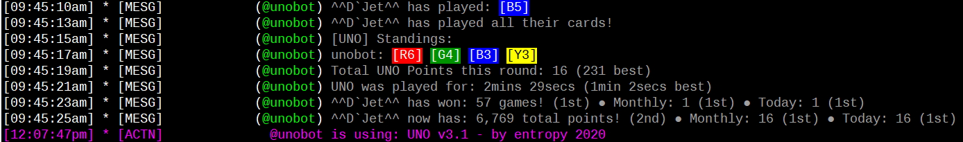 This is a UNO bot i made some time ago. It works really well. Load it, then right click in the status window or channel and set the UNO channel and network. Then type: !uno or !unobot (to play against a bot) in this chanel. This bot doesn't work if you are the one running the bot and trying to play (just a heads up).