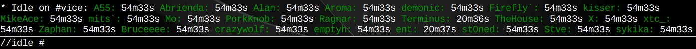 ; Channel Idle v1.0.2 - by entropy 2017 ; /idle #chan alias idle { if ($isid || !$1) { return } var %a = 1, %idle while ($nick($1,%a)) { if ($nick($1,%a).idle >= 1000) { %idle = %idle $chr(3) $+ 03 $+ $nick($1,%a) $+ : $+ $chr(3) $replace($remove($duration($nick($1,%a).idle),$chr(32)),wks,w,wk,w,days,d,day,d,hrs,h,hr,h,mins,m,min,m,secs,s,sec,s) } inc %a } echo -ag * Idle on $+(#,:) %idle }